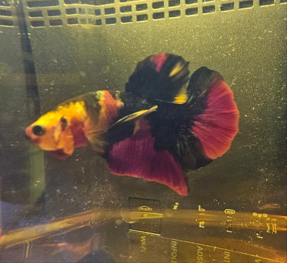 Uno dei varietà più popolari degli ultimi anni: il Black Base Candy si distingue per il corpo a base nera, impreziosito da piccole macchie rosse o gialle che creano un effetto cromatico vivace e originale. La forma è armoniosa e la pinna caudale mostra una curvatura perfetta a “C”.