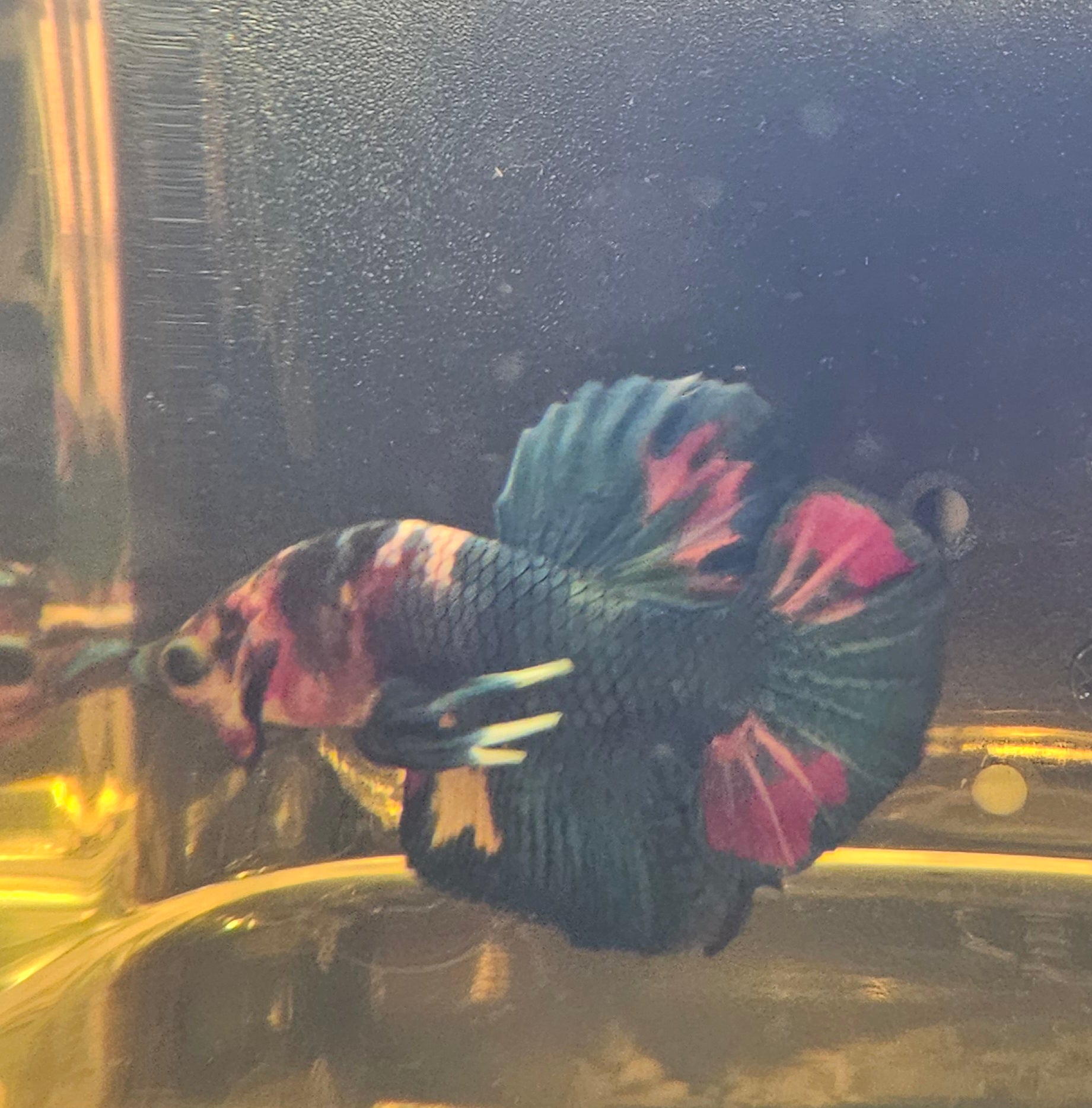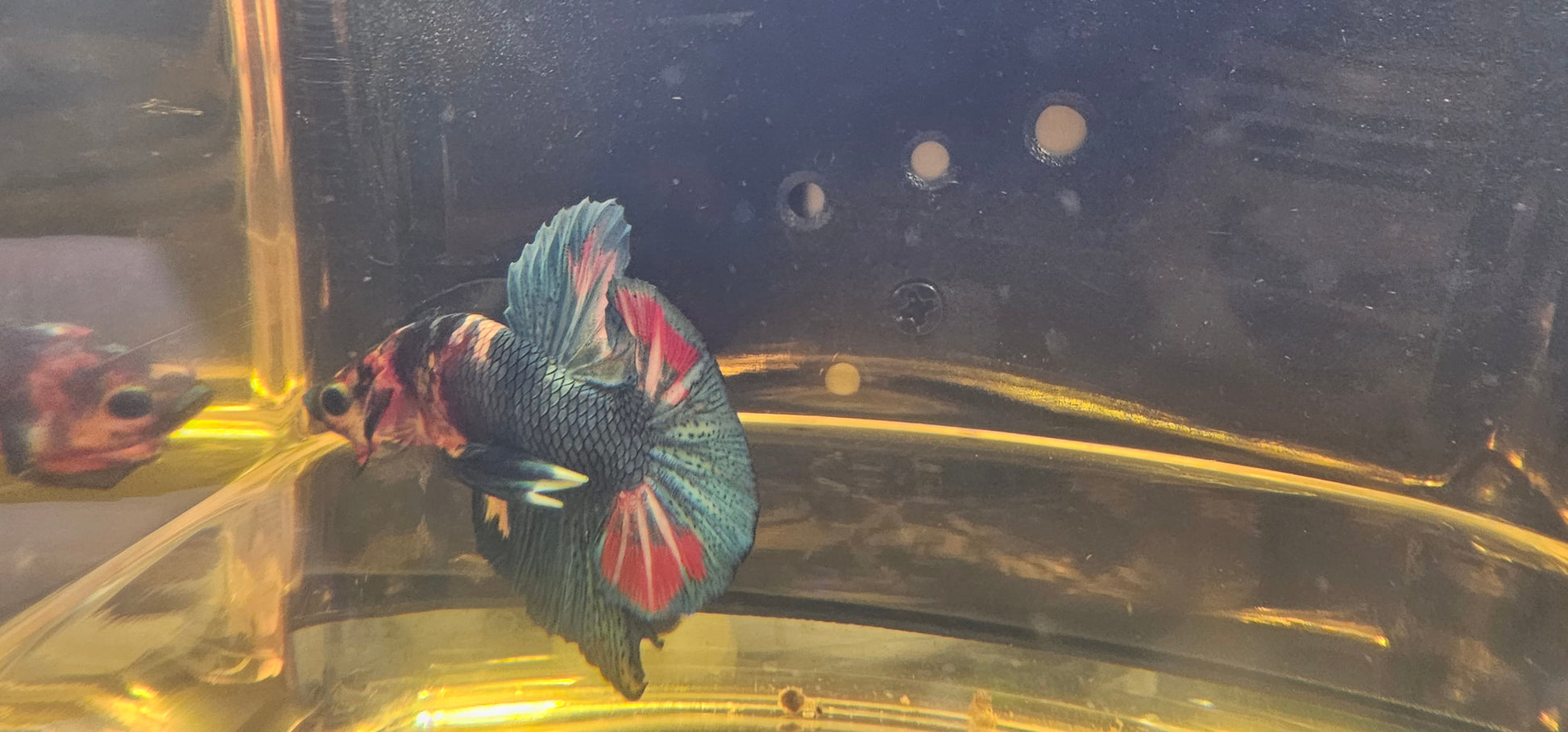 Esemplare maschio di Betta CANDY dal colore unico e affascinante. Il corpo è dominato da un intenso colore turchese, impreziosito da punti rossi e gialli, con due macchie rosse ben visibili sulla coda. La pinna caudale presenta una forma a C perfetta, sinonimo di alta qualità.