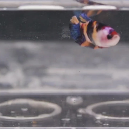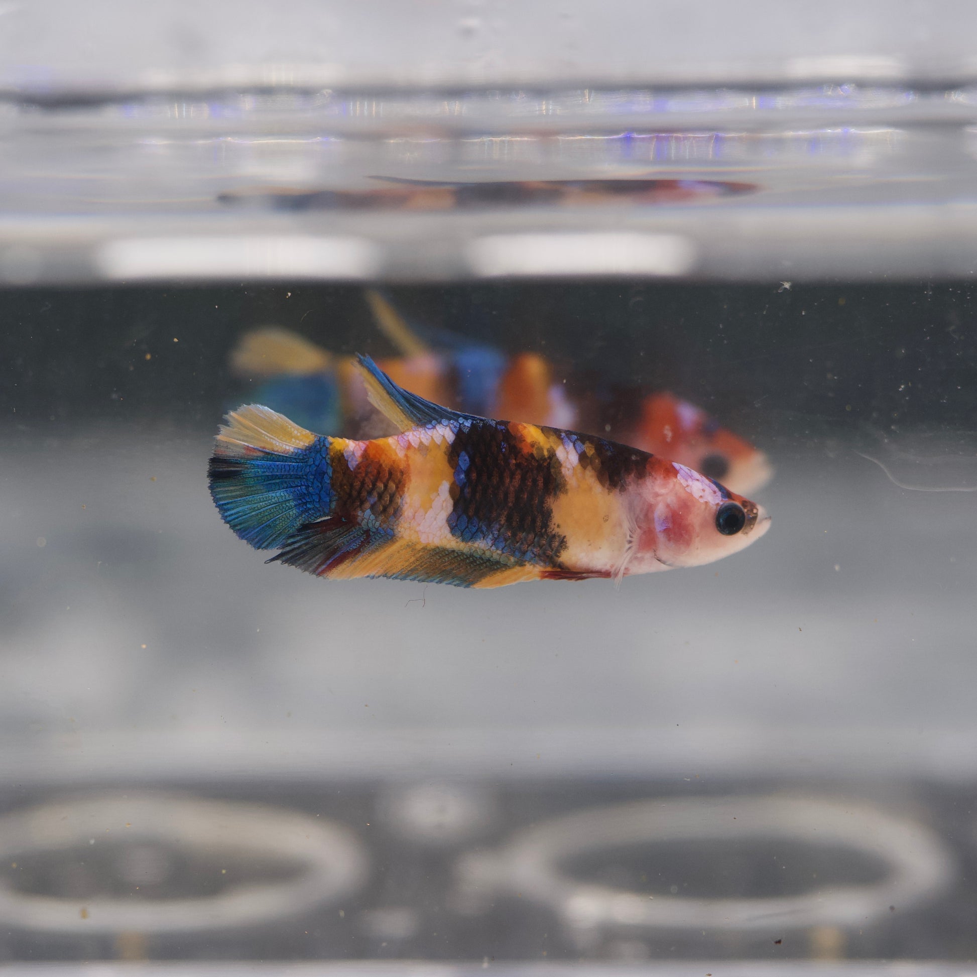 Esemplare femmina di altissima qualità, perfetta per la riproduzione. Il corpo presenta grandi blocchi di colore distribuiti armoniosamente: giallo e blu come tonalità principali, arricchiti da delicate sfumature bianche e puntini viola effetto “GALAXY ”.