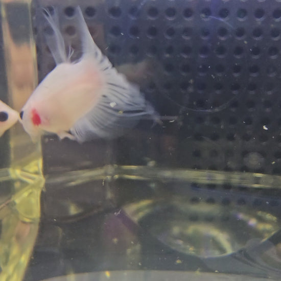Un Betta completamente trasparente, senza alcuna macchia di colore sul corpo. Gli occhi sono completamente neri, privi di qualsiasi imperfezione.