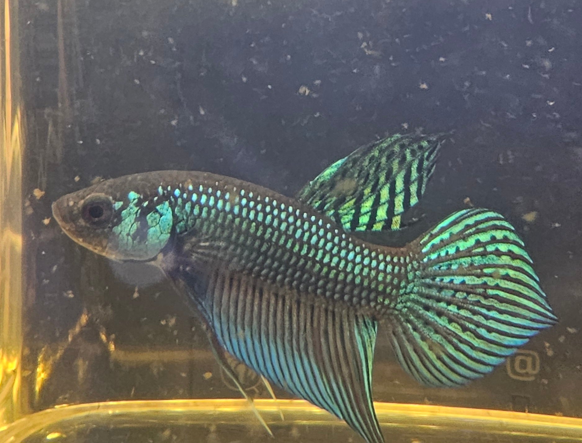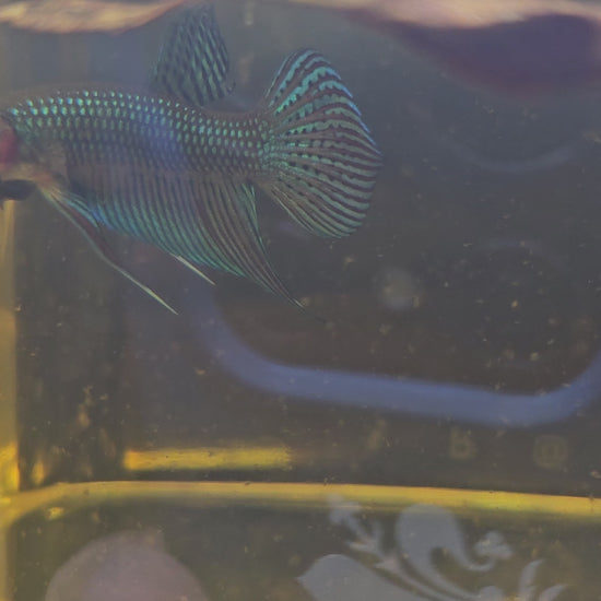 Una splendida varietà selvatica di Betta Mahachai. Il corpo presenta riflessi metallici che sfumano dal verde al blu, con una coda dalla forma perfetta a chitarra, rara e pregiata.
