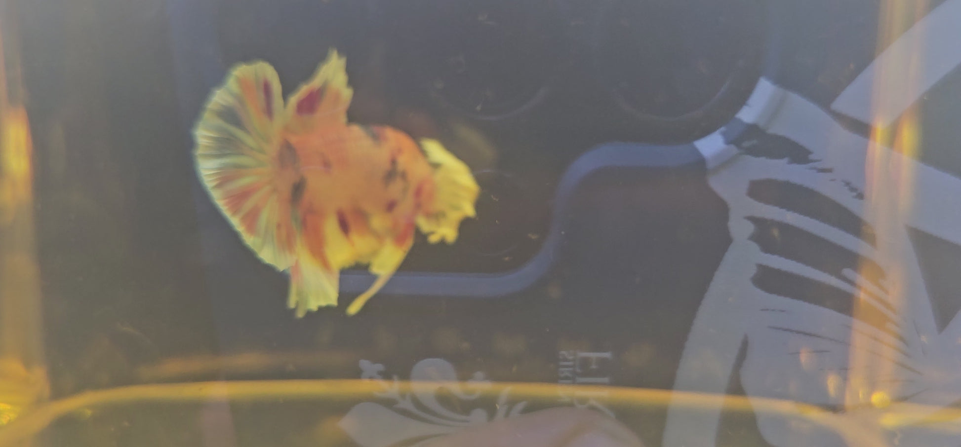 Una bellissima betta Plakat maschio Dumbo, con colorazione multicolor e grandi pinne pettorali. Il corpo ha una base rosa tenue, con sfumature armoniose e un corpo proporzionato e robusto.
