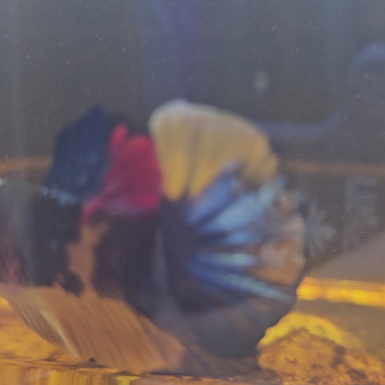 Un esemplare eccezionale per colorazione e forma: il corpo è di un intenso arancione, arricchito da grandi macchie blu, rosse e nere, con una coda arcobaleno davvero spettacolare.