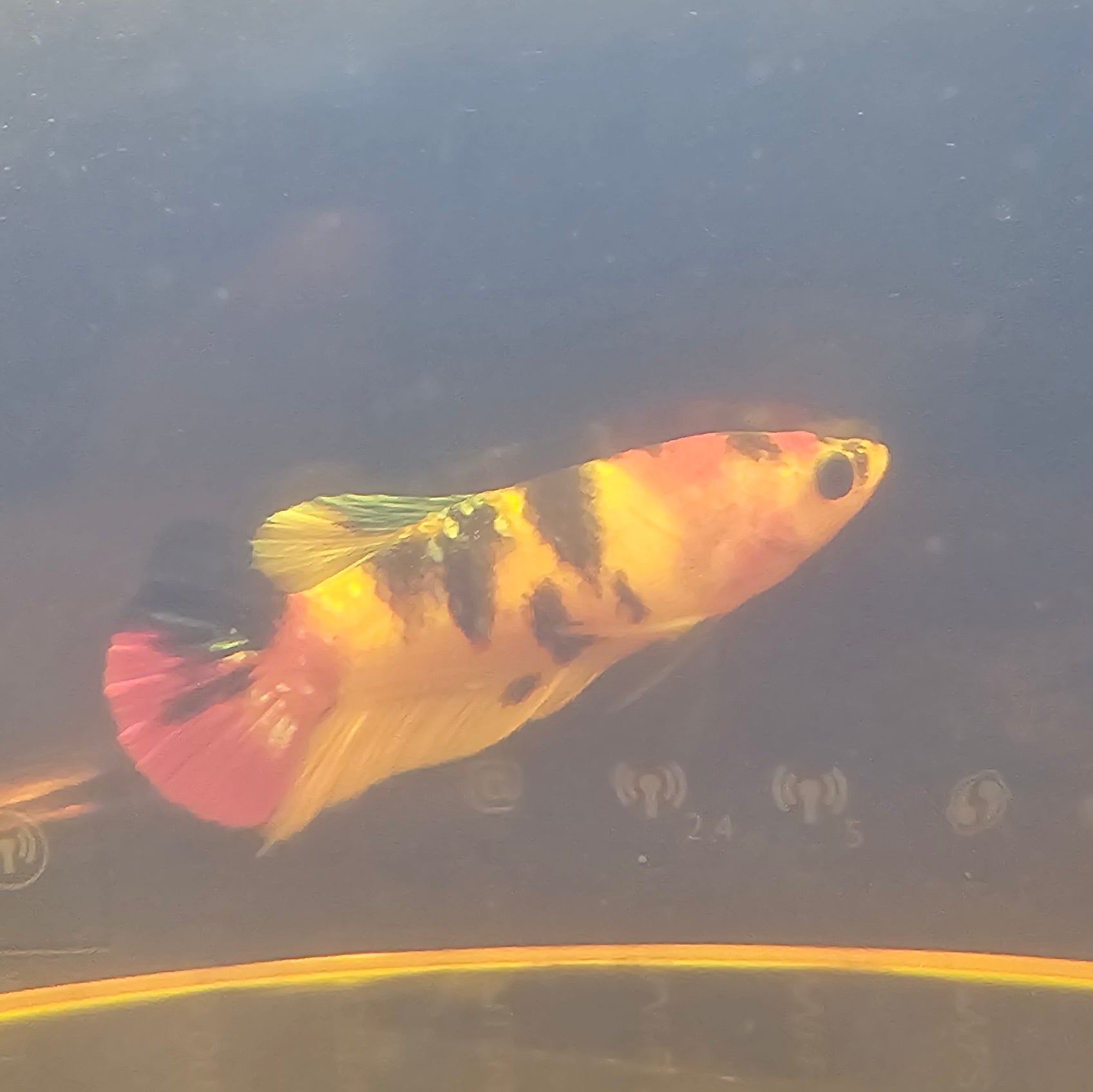 Una femmina di eccezionale qualità, ideale per progetti di riproduzione. Presenta una combinazione genetica eccellente con colori ben definiti: giallo brillante, rosso intenso e alcune scaglie nero che donano riflessi metallici unici. Un vero gioiello per ogni appassionato.