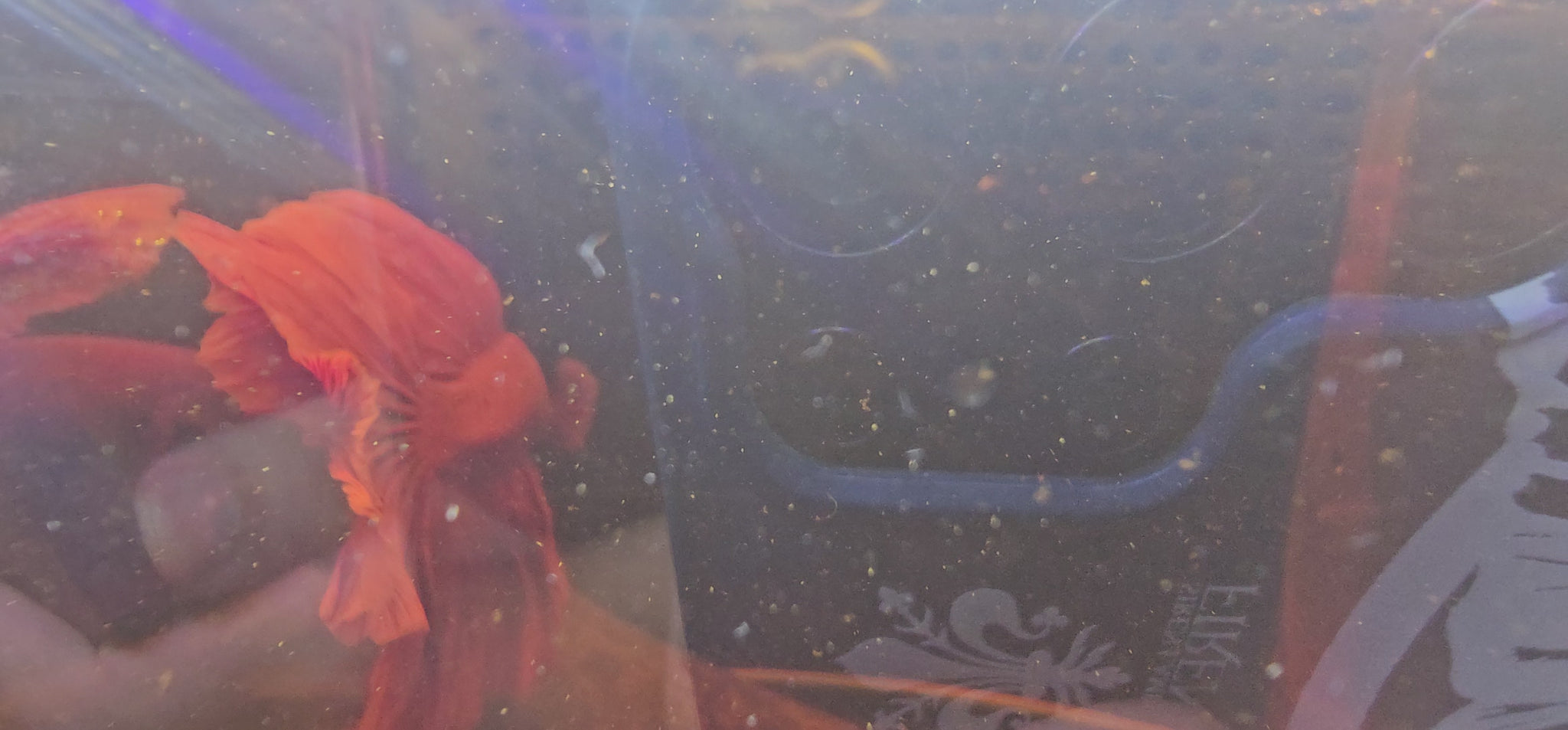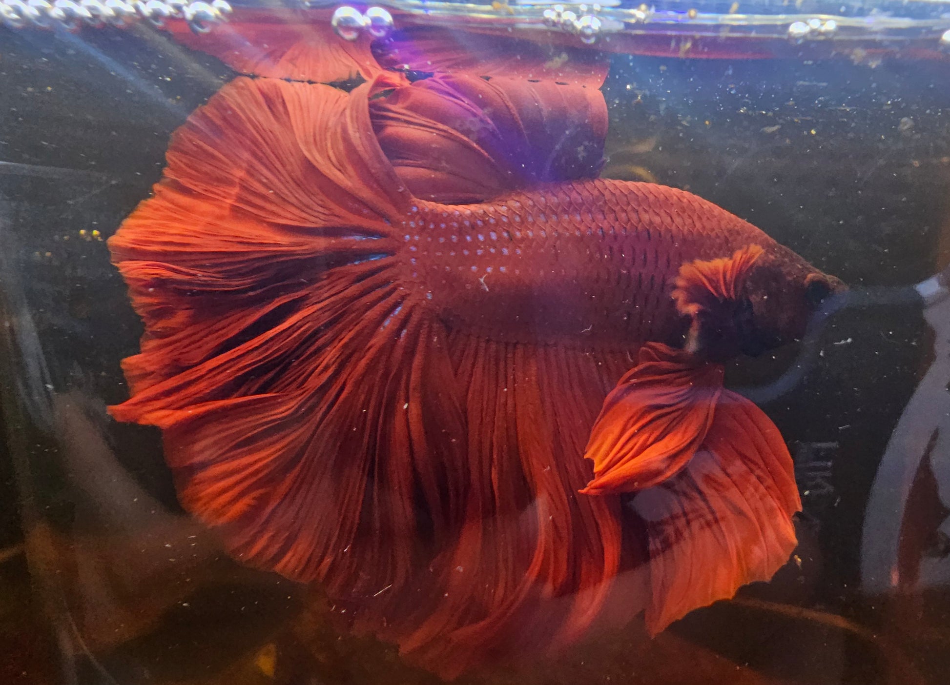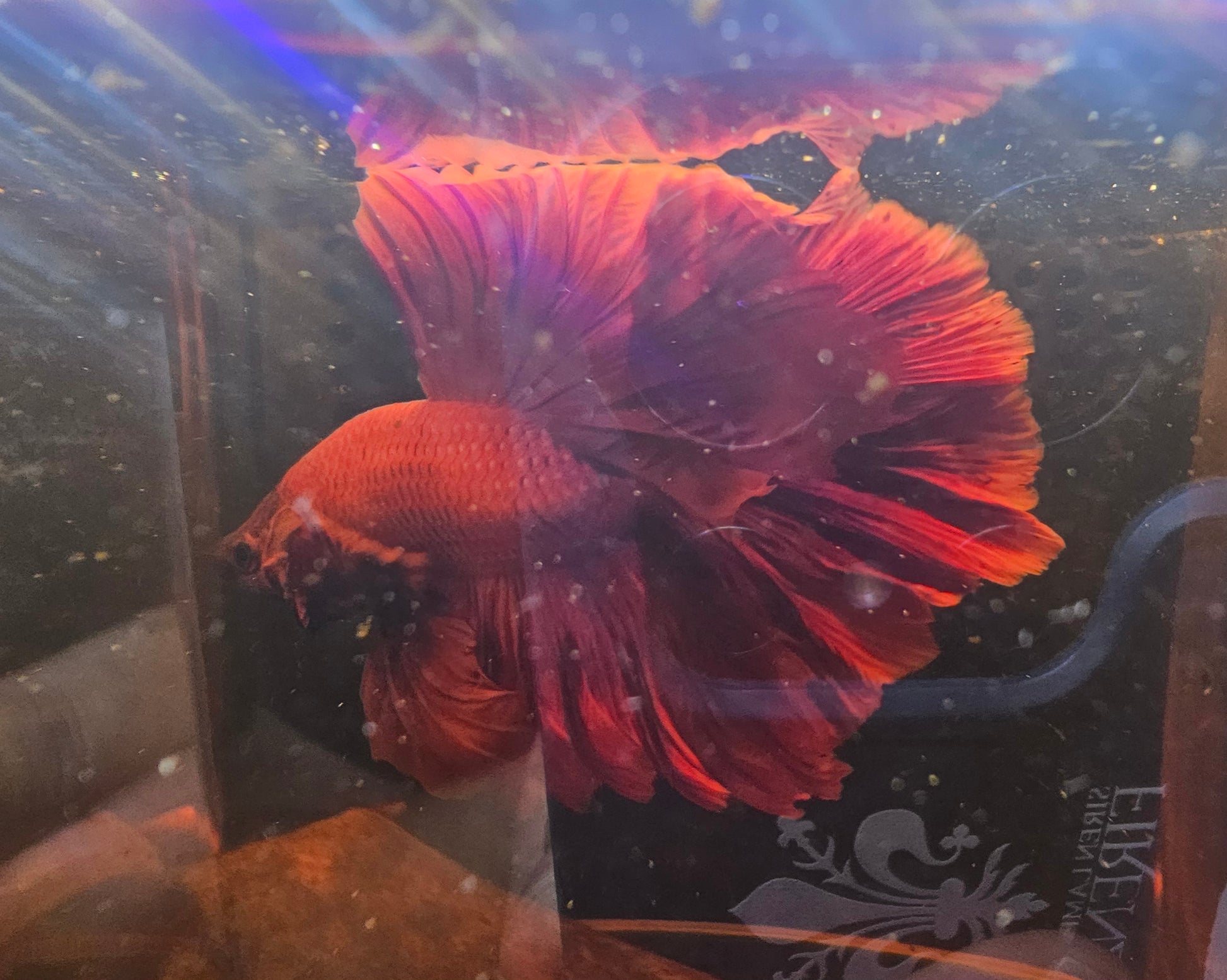 Questo Betta è interamente rosso, senza alcuna sfumatura o colore aggiuntivo. La sua coda spessa e a forma di rosa lo rende un esemplare elegante e di grande impatto visivo.