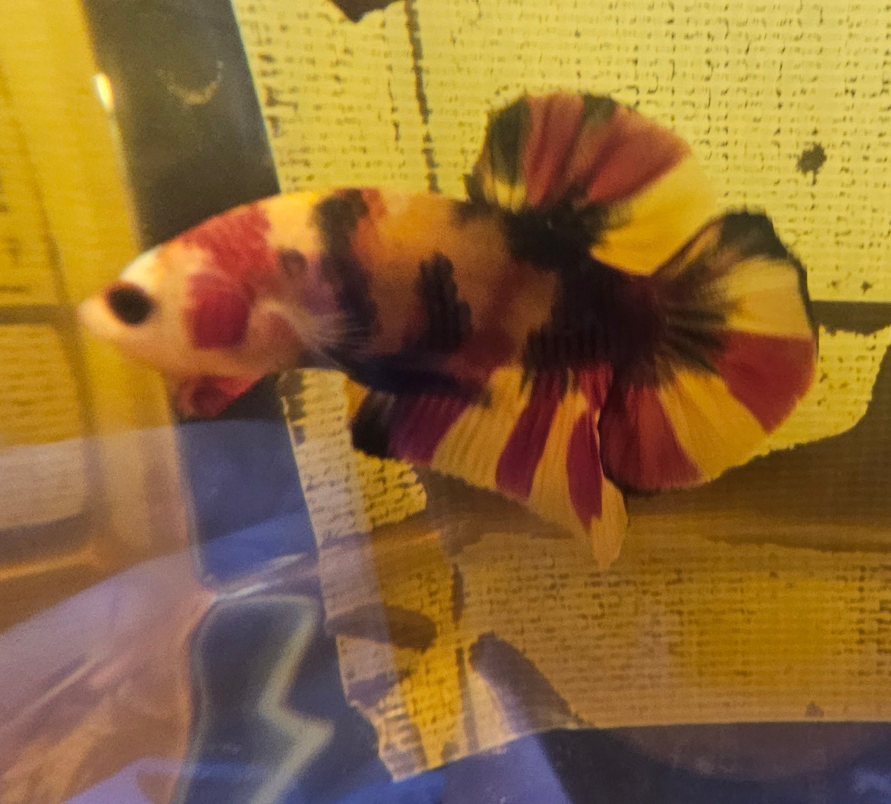 Una colorazione classica e intramontabile: il corpo presenta ampie aree di rosso e giallo, arricchite da alcune macchie nere che creano un bel contrasto. La forma è ben proporzionata e la pinna caudale ha una perfetta curvatura a “C”.