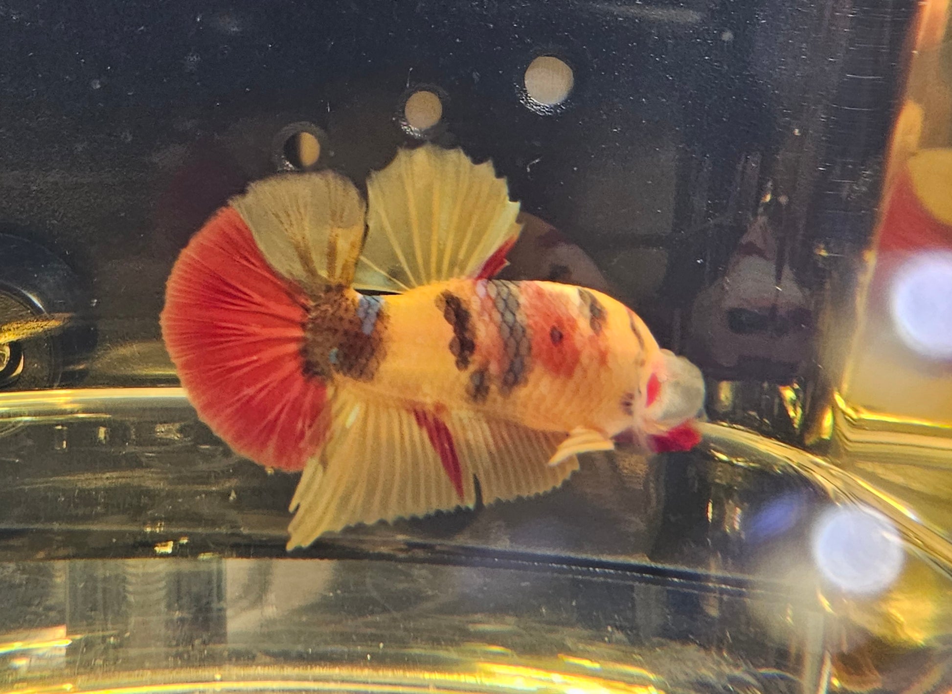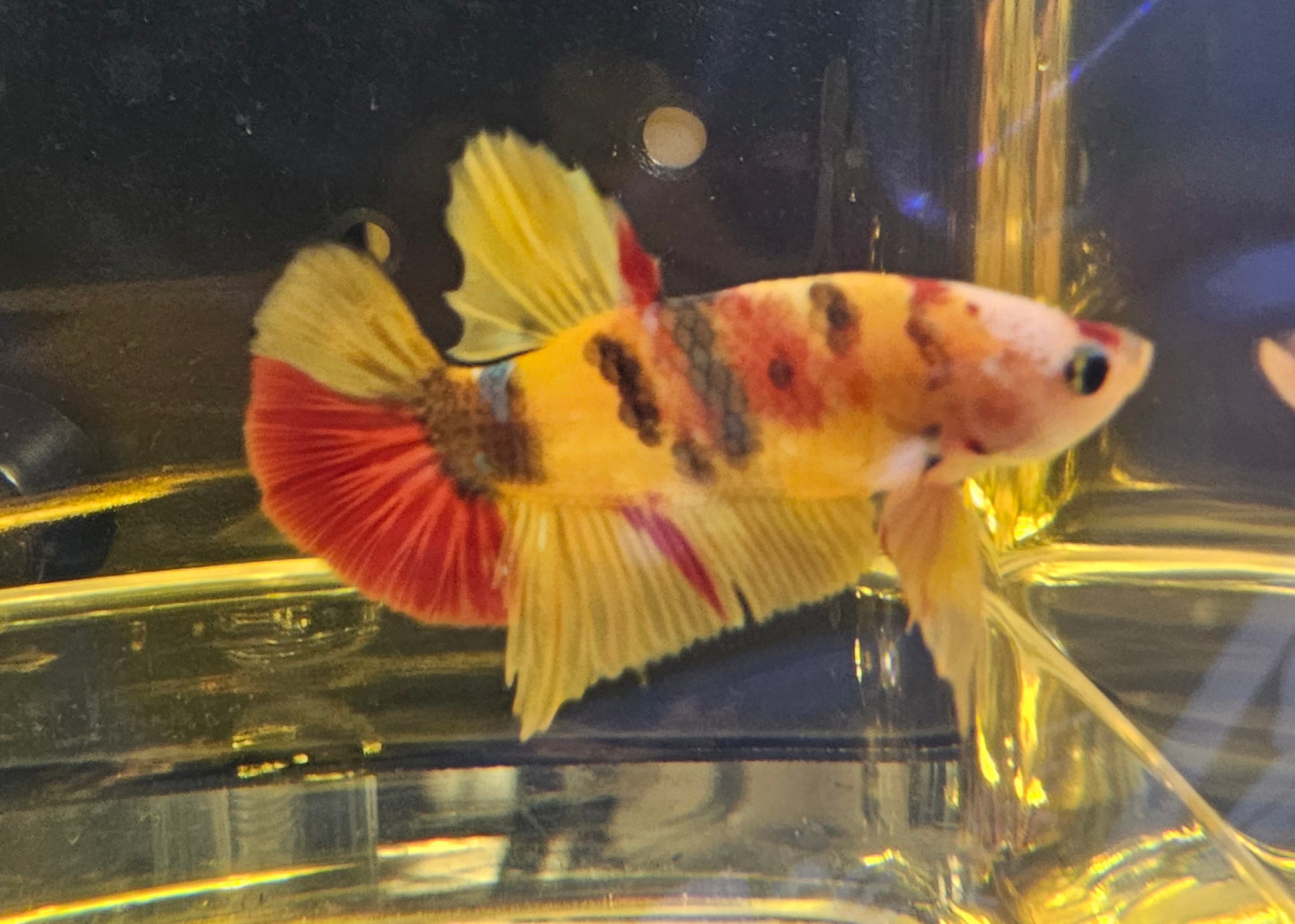 Descrizione: Esemplare unico e molto caratteristico: corpo di un giallo acceso con macchie multicolori che ricordano un dipinto a olio. La coda è divisa in due sezioni, una gialla e una rossa.